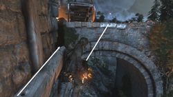Continuer sur le balcon puis sur la petite poutre contre le mur et s’élancer vers le pont. Se rétablir et aller à gauche pour trouver 1 relique (3/3) près du portail (EXP +25). Suivre le pont, ouvrir 1 caisse pour trouver des matériaux, sauter par-dessus le gouffre et aller jusqu’à l’entrée bloquée par une barrière. Utiliser 1 flèche-grenade pour dégager le chemin. Récupérer des flèches explosives sur la droite si nécessaire, puis passer sous la porte.