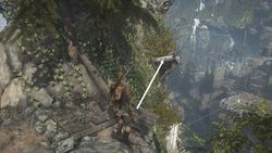 Lorsque Lara peut prendre appui sur ses jambes, faire un saut vers la droite et s’accrocher à la paroi avec les piolets. Monter et se hisser dans la tour. Lara trouve la flasque de pétrole, et peut désormais créer des flèches incendiaires (EXP +100). Récolter automatiquement du pétrole et des flèches incendiaires.