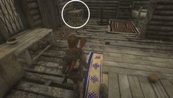 Sauter sur le toit de la maison juste en face et récolter des plumes dans un nid. Entrer ensuite dans la maison et trouver 1 document (1/16) (Grec EXP +15) sur la table (EXP +15). Ressortir et grimper dans la tour en ruines. Ouvrir 1 coffre-fort (2/5) verrouillé pour trouver 1 pièce de pistolet lourd (1/4) (EXP +50).