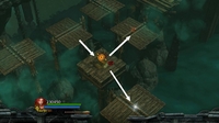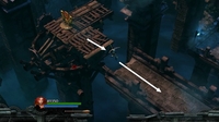 Sauter sur les deux petites plateformes en bois puis sur la grande en ramassant 4 gemmes au passage. Tuer ensuite les 2 démons et les 2 démons sorciers qui apparaissent. Briser l'urne sur la plateforme et récolter 1 recharge munitions. Noter l'interrupteur au loin sur la droite et utiliser une lance pour l'actionner.