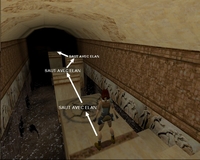 Sortir du bassin et aller à droite. Tuer 1 crocodile. Prendre le couloir à droite de l'escalier.