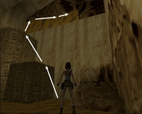 Tuer 4 panthères de plus. En bas, prendre une petite trousse et une grande trousse. Remonter et poursuivre. A la fin du couloir bleu, tuer 1 momie (très méchante !). Noter le petit tas de sable dans le coin de la pièce : lorsque Lara se place sur la partie la plus élevée du tas de sable, la momie n'attaque pas.