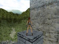 (Il est possible de monter sur le toit des tours, mais cela ne sert à rien et ce n'était pas prévu à mon avis. Le chemin est long et les sauts difficiles : sauver souvent ! Aller à droite à la sortie de la tour. Monter sur le rempart contre la tour. Examiner la vallée en dessous : elle est arrêtée par des parois vertes qui montent sur plusieurs niveaux. Appelons la paroi gauche A, celle en face B et celle de droite C. En partant d'en haut, il y a le sommet, un premier niveau en dessous, un second niveau, etc. Il faut aller sur le second niveau. Pour se faire, sauter avec élan en diagonal du rempart et aller à droite durant le saut.