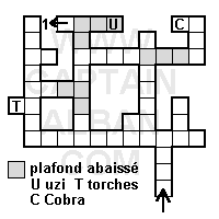 Voir le plan. Tuer 1 cobra. Aller vers la sortie. Ramasser une recharge torche et un cristal.