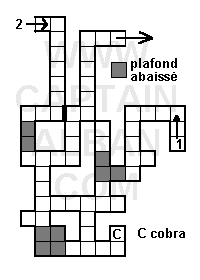 Descendre avec précaution par le trou. En bas, tuer 4 cobras (il est possible de se mettre bien au milieu des quatre, hors de portée). Avancer et éviter un boulet. Tuer 6 cobras.