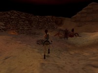Faire un saut avec élan vers la plate-forme à droite et s'éloigner rapidement du bord, tuer un scarabée et un scorpion géant et ramasser une petite trousse. Avancer ensuite entre les deux pyramides, et pousser le seul bloc amovible au fond du passage : une porte s'ouvre sur le flanc de la pyramide. Entrer et ouvrir la trappe, puis y descendre.