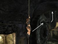 Sauter vers l'arrière pour atteindre la faille, se laisser tomber pour attraper celle du dessous. Aller jusqu'à la cassure et faire un saut latéral pour continuer. Sauter vers le rebord du haut, avancer vers la droite et sauter pour atteindre enfin le sol.