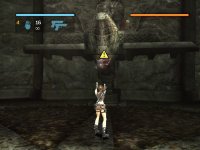 Passer devant la statue et aller jusqu'à la plate-forme où se trouve un bloc décoré. Pousser le bloc sur la plaque incrustée : le bras gauche de la statue est complètement libre. Revenir maintenant sur la plate-forme d'avant. Marcher sur la plaque : le bras droit est libre, mais le temps est compté. Sauter sur la dalle pivotante sans perdre un instant puis sauter devant la statue et utiliser le grappin sur son coeur pour actionner le mécanisme.