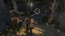 Revenir vers le baril bleu et sauter vers la plateforme suspendue au milieu de la pièce. La contourner et grimper, puis sauter vers le toit. Faire le tour du gouffre pour fouiller les corps, puis brûler 1 drapeau (3/4) (EXP +10) accorché au mur. Continuer à contourner le gouffre et ramasser 1 géocache (3/5) (EXP +5) dans les hautes herbes.