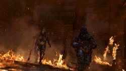 Suivre le couloir jusqu'à un escalier et éliminer 1 tireur Solarii (EXP +20) et 2 fusiliers Solarii (EXP +40). Une explosion balaie les autres arrivants. Descendre les marches, fouiller les corps et ramasser 20 munitions pour fusil et 5 munitions pour fusil à pompe sur le sol. Dans le couloir suivant, éliminer 1 garde lourd Solarii (EXP +20) et 1 fusilier Solarii (EXP +20). S'abriter derrière le coin pour tuer 1 tireur Solarii (EXP +20), 2 fusiliers Solarii (EXP +40) et 1 garde lourd Solarii (EXP +40). Poursuivre vers le couloir enfumé et regarder la cinématique.