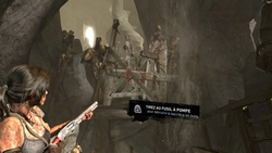 Noter la porte de sortie et se placer à l'opposé dans le tombeau. Tirer une flèche-grappin dans la corde pour la faire se balancer et percuter la grille : la sortie est libérée. Passer par la porte nouvellement ouverte et se glisser sous les décombres pour découvrir le camp « Alcôve abritée ». Dépenser 1 point pour débloquer la compétence « Expert en piolets » pour Lara (utile dans les combats au corps à corps) puis utiliser 400 matériaux pour obtenir l'amélioration « Étranglement maximum » pour le fusil à pompe. Tirer une balle dans la barrière pour dégager l'ouverture, puis ramasser 5 muntions pour fusil à pompe sur le sol.