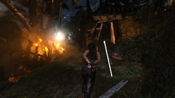 Faire le tour du toit et descendre vers le feu de camp en se laissant tomber prudemment. Dépenser 1 point de compétence pour débloquer « Capacité de munitions ». Lara peut désormais transporter 30 flèches (au lieu de 20) ainsi que 60 balles de pistolet (au lieu de 45). Si possible, utiliser 250 matériaux pour acheter l'amélioration « Frein de bouche » du pistolet.
