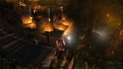 Forcer l'ouverture de la porte au bout du passage grâce au piolet, puis entrer : les Solarii sont sur les pas de Lara et mettent le feu à la cabane. Appuyer sur la touche suivante pour détruire la barrière :