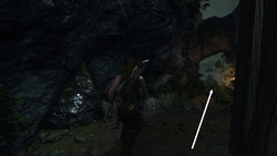 En haut, tourner tout de suite à gauche et descendre vers le point d'eau. Passer sous la chute d'eau. Dans la petite caverne, noter un filet mais il est impossible d'y mettre le feu pour le moment : Lara ne peut garder sa torche allumée en pénétrant dans la caverne. Sur la droite, ramasser 1 carte au trésor (EXP +25) posée sur une caisse. Ressortir et remonter au sommet de l'échelle de corde.