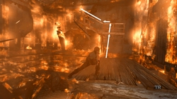 Monter à la paroi escarpée et entrer dans la tour. Grimper et s'échapper avant que les flammes ne consumment le bâtiment. Sortir de la tour, descendre vers le pont et le traverser. Escalader la tour, traverser le mur et monter sur les tôles. De retour dans la tour, grimper sur l'escalier, s'accrocher à la caisse suspendue et sortir. Grimper vers le toit. S'élancer vers l'hélicoptère.
