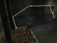 Sauter vers le poteau pour que Lara s'y perche et sauter vers le rebord. Suivre le couloir, descendre dans le trou via les aspérités du mur et le traverser. Grimper sur le bloc près du poteau, puis s'agripper à la corniche, progresser vers la droite, faire un saut arrière vers la barre horizontale puis attraper la corniche.