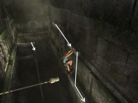 Sauter à droite en évitant les flèches, s'élancer vers le rebord suivant. Lâcher prise pour descendre d'un niveau. Faire un saut arrière pour se percher sur le poteau. Faire un saut en avant pour atterrir sur la plate-forme suivante. Ramasser 1 kit de premier secours et suivre le couloir.