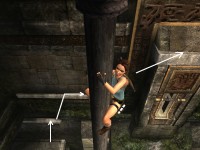 Revenir près des grilles fermées et s'élancer vers le sommet du pilier déplacé, puis vers le rebord. Contourner le coin, grimper d'un niveau et s'élancer vers le rebord du pilier à droite puis se hisser au sommet.