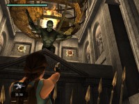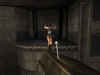 Ressortir. Sauter vers le pilier de droite de la structure centrale. Contourner le coin, lâcher prise, se rattraper à la corniche. Grimper sur le bloc cassé, attraper le rebord, sauter vers le haut et se hisser. Remonter tout en haut grâce aux rebords et sauter vers la première plate-forme que Lara a tiré.