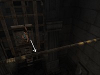 Monter sur le pilastre et traverser. Monter sur les blocs de droite, tirer la cage. Revenir sur le pilastre et sauter vers le rebord de droite pour s'y suspendre. S'élancer vers le rebord suivant, contourner le coin et ramasser 1 kit de premier secours. Revenir sur la structure centrale.