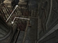Sauter ensuite de pilier en pilier et vers l'avant pour atteindre la corniche. Suivre les rebords jusqu'à la plate-forme au-dessus de la porte et actionner le mécanisme. Attention : chrono ! Descendre rapidement et revenir à la salle centrale.