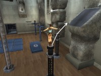 La stèle sur le mur pivote et révèle une cible : tirer sur celle-ci pour ouvrir l'une des deux grilles de la piscine. Monter sur la caisse à droite et tirer sur l'attache : la statue suspendue vibre.