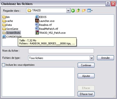 Pour accéder aux screenshots de TR6, suivez le chemin suivant : C:\Program Files\Eidos Interactive\TRAOD\ScreenShots. Les captures suivent la dénomination "Nom de la carte graphiqueXXX.tga" (exemple : RADEON_9000_SERIES__0000.tga). Sélectionnez les screenshots que vous voulez convertir et cliquez sur "Confirmer".